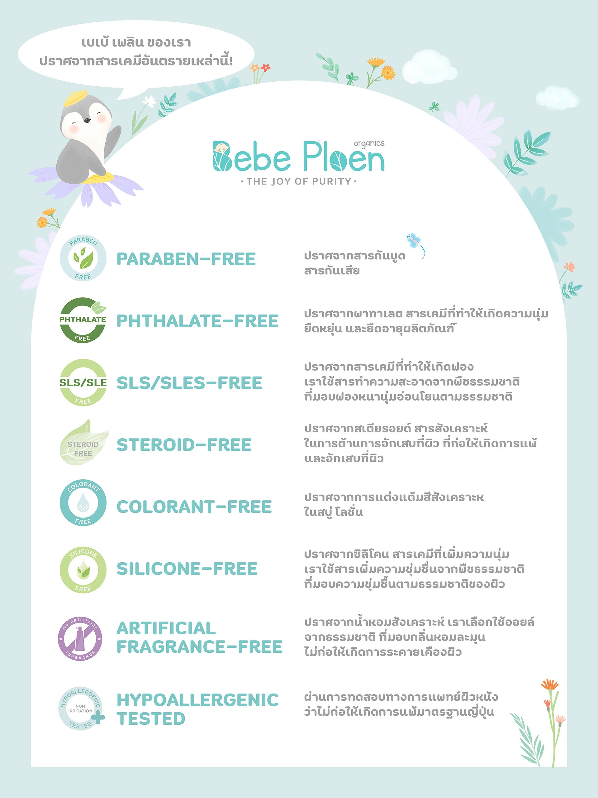 ส่วนผสมจากธรรมชาติและออร์แกนิก ของ Bebe Ploen เป็นตัวเลือกที่เหมาะสมสำหรับคุณแม่ ที่ห่วงใยต่อสุขภาพ และ ผิวของลูกน้อย